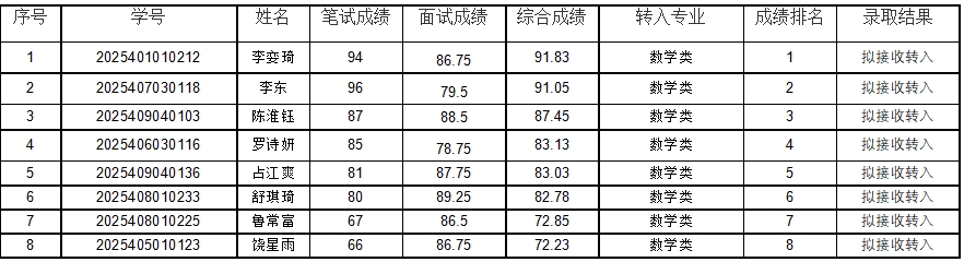 经转专业笔试与面试考核,现将2025-2026年秋季学期数理学院转专业录取名单进行公示,公示期5天(即2025年12月24日至2025年12月31日)。公示期间任何人如有意见,请以来电、来信形式向数理学院反馈。联系电话:0724-2355632(熊老师)、13797941639(王老师);电子邮箱:slxy@jcut.edu.cn。
