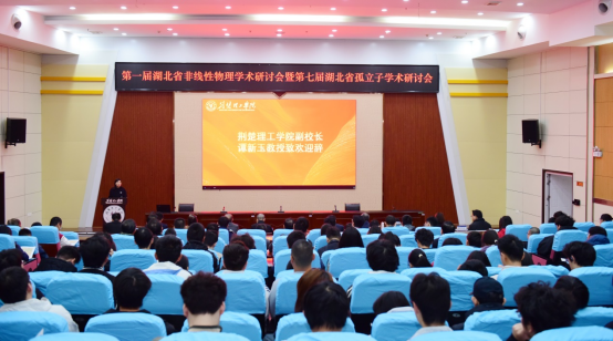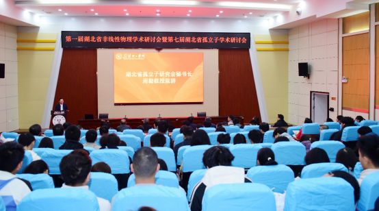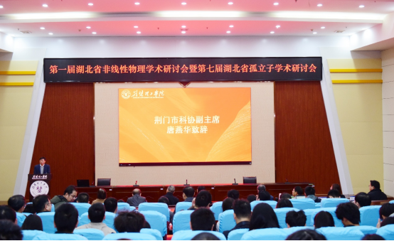 本次研讨会开幕式由数理学院院长杜锋主持。学校副校长谭新玉、荆门市科协副主席唐燕华、湖北省孤立子研究会秘书长周勤出席了开幕式并致辞。
