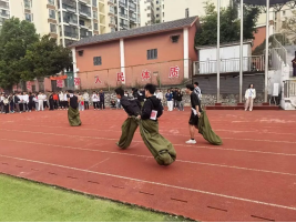 周佳怡同学在学生女子组夹包甩远比赛中荣获第一名