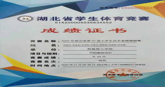 近日,由湖北省学生体育协会主办,武汉理工大学承办的2025年湖北省第37届大学生武术套路锦标赛在武汉落下帷幕。经过多轮激烈角逐,我院2024级数学与应用数学2班学生陈慧萍取得佳绩,斩获女子甲组太极器械类第二名、初级棍第三名,并与团队荣获甲组集体项目一等奖!