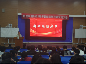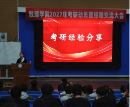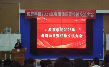 为激发数理学子考研热情,明确备考方向,传承优良学风,助力2023级学生高效备战2027年研究生入学考试,4月6日晚19:00,数理学院2027年考研动员暨经验交流大会在钟楼三楼报告厅隆重举行。学院院领导、全体辅导员、2023级各班学业导师及全体2023级学生齐聚一堂,共赴逐梦之约,大会由学院党委副书记主持。